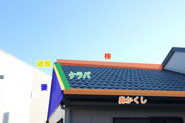 ・切妻屋根には「 棟 」「 鼻かくし 」「 ケラバ 」「 破風 」がある